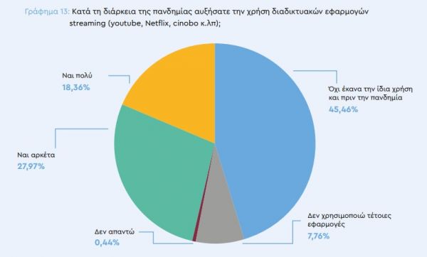 Αντίστοιχα, σχεδόν οι μισοί (46,3%) έχουν αυξήσει τη χρήση εφαρμογών streaming, ειδικά οι νεότεροι σε ηλικία και οι υψηλότερα αμειβόμενοι.