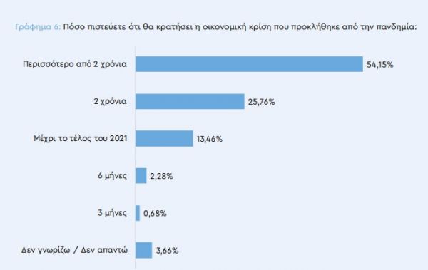 Διάχυτη απαισιοδοξία καταγράφεται σχετικά με τη διάρκεια της οικονομικής κρίσης που προκλήθηκε από την πανδημία, καθώς περίπου 8 στους 10 (79,9%) ερωτώμενους θεωρούν ότι η κρίση θα διαρκέσει για τουλάχιστον δύο χρόνια.