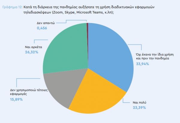 Η πανδημία φαίνεται επίσης να αλλάζει τον τρόπο με τον οποίο εργαζόμαστε, επικοινωνούμε και ψυχαγωγούμαστε. Οι μισοί ερωτώμενοι (49,7%) αποκρίθηκαν ότι αύξησαν τη χρήση εφαρμογών τηλεδιασκέψεων, με αυτούς που βρίσκονται στα υψηλότερα εκπαιδευτικά επίπεδα, τους φοιτητές, τους κατοίκους μεγάλων αστικών κέντρων και τους υψηλότερα αμειβόμενους να εμφανίζουν την τάση αυτή πιο έντονα.
