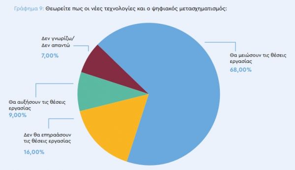 Ωστόσο, παρά την αισιοδοξία που επικρατεί για τον ψηφιακό μετασχηματισμό γενικά, σχεδόν 7 στους 10 (68%) ερωτώμενους πιστεύουν ότι θα μειώσει τις θέσεις εργασίας, με τους ανέργους, τους συνταξιούχους και αυτούς με χαμηλότερο εκπαιδευτικό υπόβαθρο να είναι πιο απαισιόδοξοι.