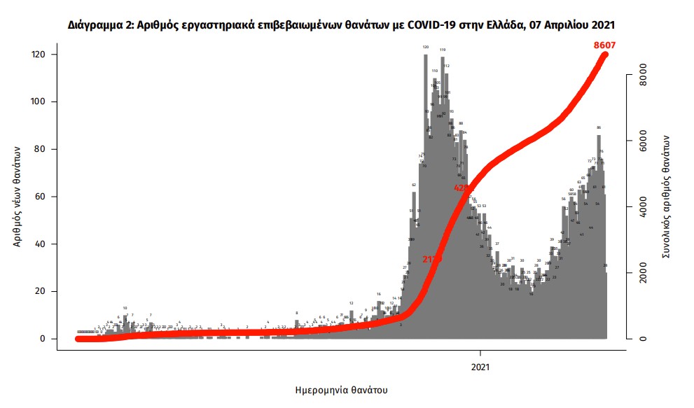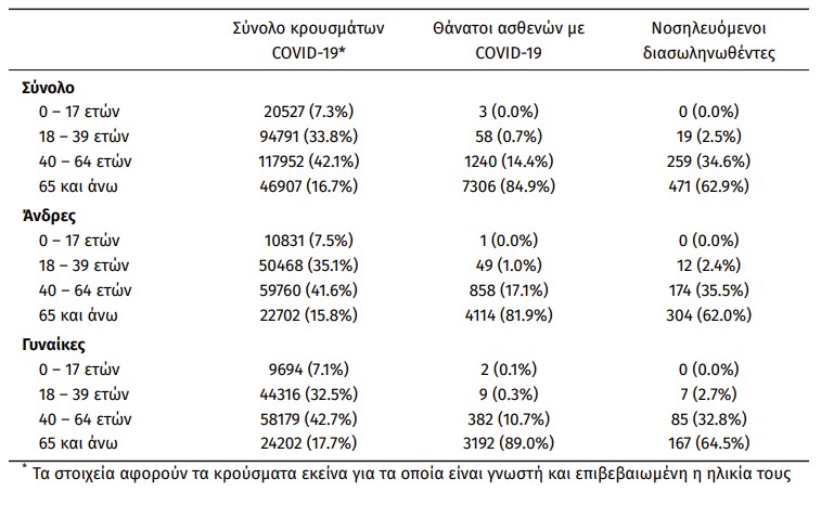 Οι νέοι θάνατοι ασθενών με COVID-19 είναι 75, ενώ από την έναρξη της επιδημίας έχουν καταγραφεί συνολικά 8.607 θάνατοι. Το 95.6% είχε υποκείμενο νόσημα ή/και ηλικία 70 ετών και άνω.
