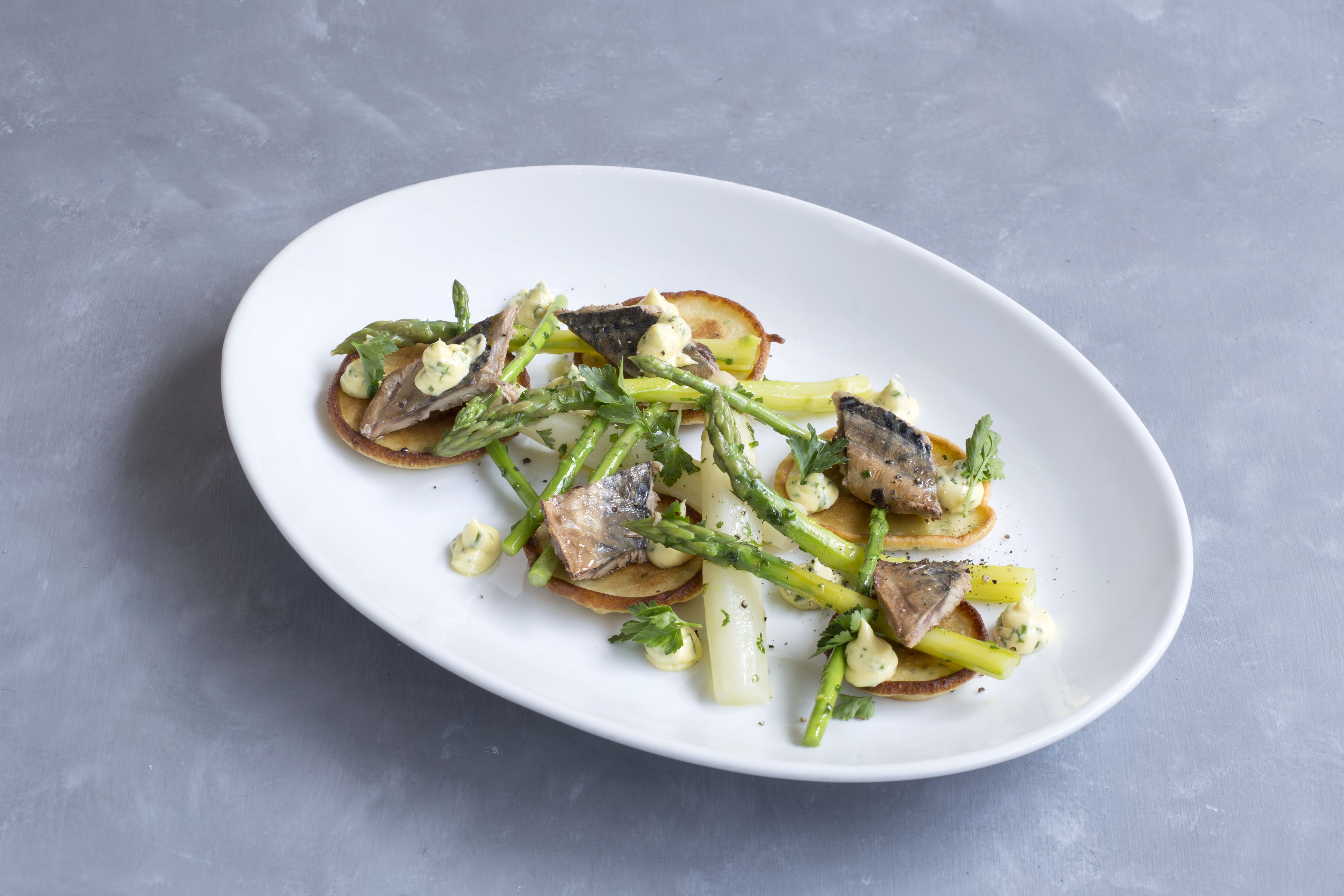 Σε μια πιατέλα βάζουμε τα πιτάκια. Πάνω από κάθε πιτάκι βάζουμε δύο κομμάτια σπαράγγι, ένα κομμάτι σκουμπρί καπνιστό και λίγη από τη σάλτσα. Τελειώνουμε με λίγο φρεσκοτριμμένο πιπέρι.