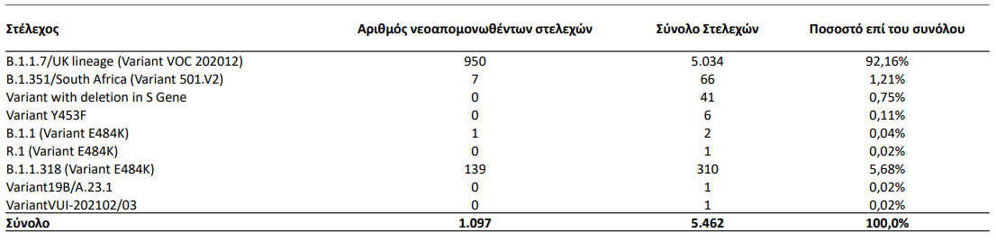Από τον έλεγχο των 1.212 δειγμάτων, αναδείχθηκαν συνολικά 957 δείγματα με στελέχη μεταλλάξεων ειδικού ενδιαφέροντος (Variants Of Concern – VOC) και 140 δείγματα με στελέχη υπό διερεύνηση (Variants Under Investigation – VUI). Εκ των 957 δειγμάτων με στελέχη μεταλλάξεων ειδικού ενδιαφέροντος, τα 950 αφορούσαν τη μετάλλαξη Β.1.1.7/UK lineage (Variant VOC_202012) και 7 αφορούσαν τη μετάλλαξη B.1.351/South Africa (Variant 501.V2), ενώ από τα 140 δείγματα με στελέχη VUI, τα 139 αφορούσαν το στέλεχος B.1.1.318 (Variant_E484K) και 1 αφορούσε το στέλεχος Β.1.1 (Variant_Ε484Κ).