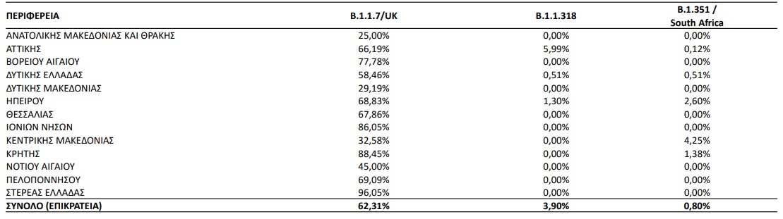 Κυριαρχεί κατά 62,3% το βρετανικό στέλεχος με 950 νέα κρούσματα. Αυξημένος είναι και ο αριθμός της νέας μετάλλαξης του βρετανικού στελέχους (Β.1.1.318), η οποία μπορεί να «ξεφεύγει» από τα αντισώματα του οργανισμού μας, αλλά βρίσκει σθεναρή αντίσταση από τα λευκά αιμοσφαίρια.
