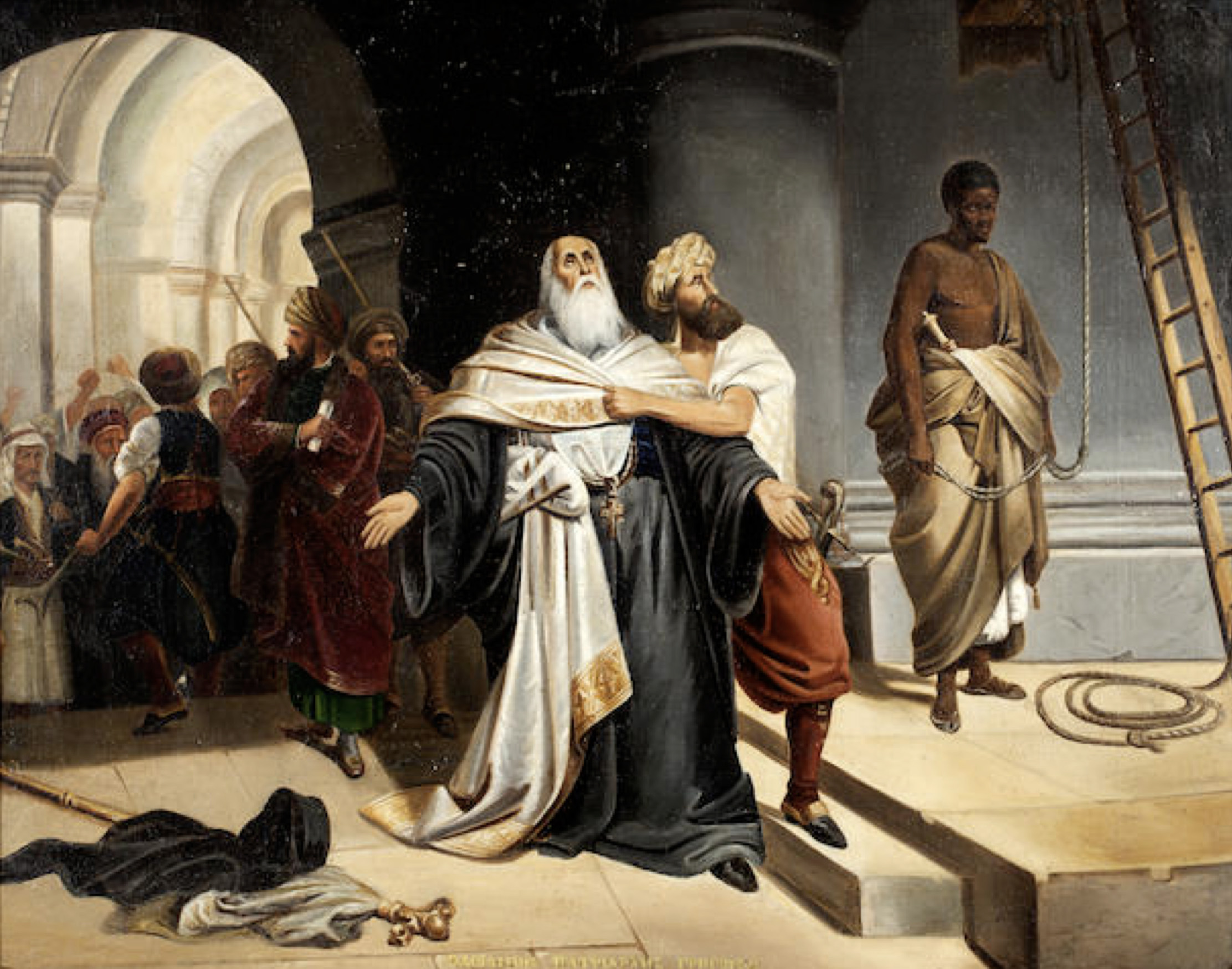 Μέσα σε αυτό, ένας απαγχονισμός. Του Πατριάρχη. Δίπλα στον άνεμο της φωτιάς, μια πράξη ατιμωτικού θανάτου από την Πύλη. Στο πρόσωπο του Πατριάρχη θανατώνονται όλοι οι Ελληνες. Ως ο νεκρός Πατριάρχης θα συρθούν. Θα καταποντιστούν, όπως ο νεκρός ρίχνεται στη θάλασσα. Αυτό έλεγε η θανάτωση, ως πολιτική πράξη.