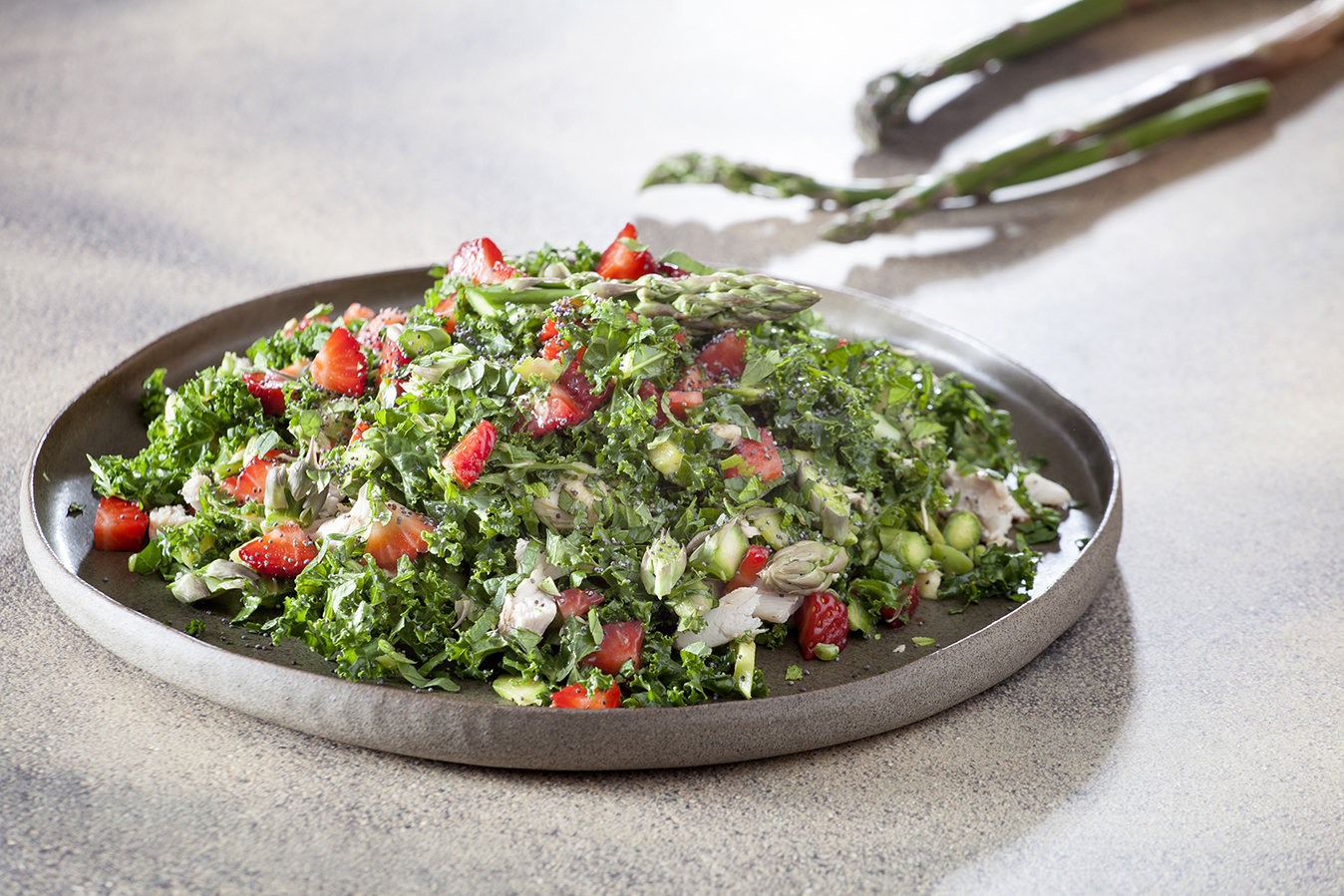 Σε ένα μπολ βάζουμε το ψιλοκομμένο κέιλ με το κρεμμυδάκι και τον δυόσμο. Κόβουμε το κοτόπουλο σε μικρά κομμάτια-μπουκιές. Με ένα peeler αφαιρούμε προσεκτικά τη φλούδα από τα σπαράγγια και τα κόβουμε σε ροδέλες. Τα προσθέτουμε και αυτά στο μπολ, καθώς και το κοτόπουλο και τις φράουλες.