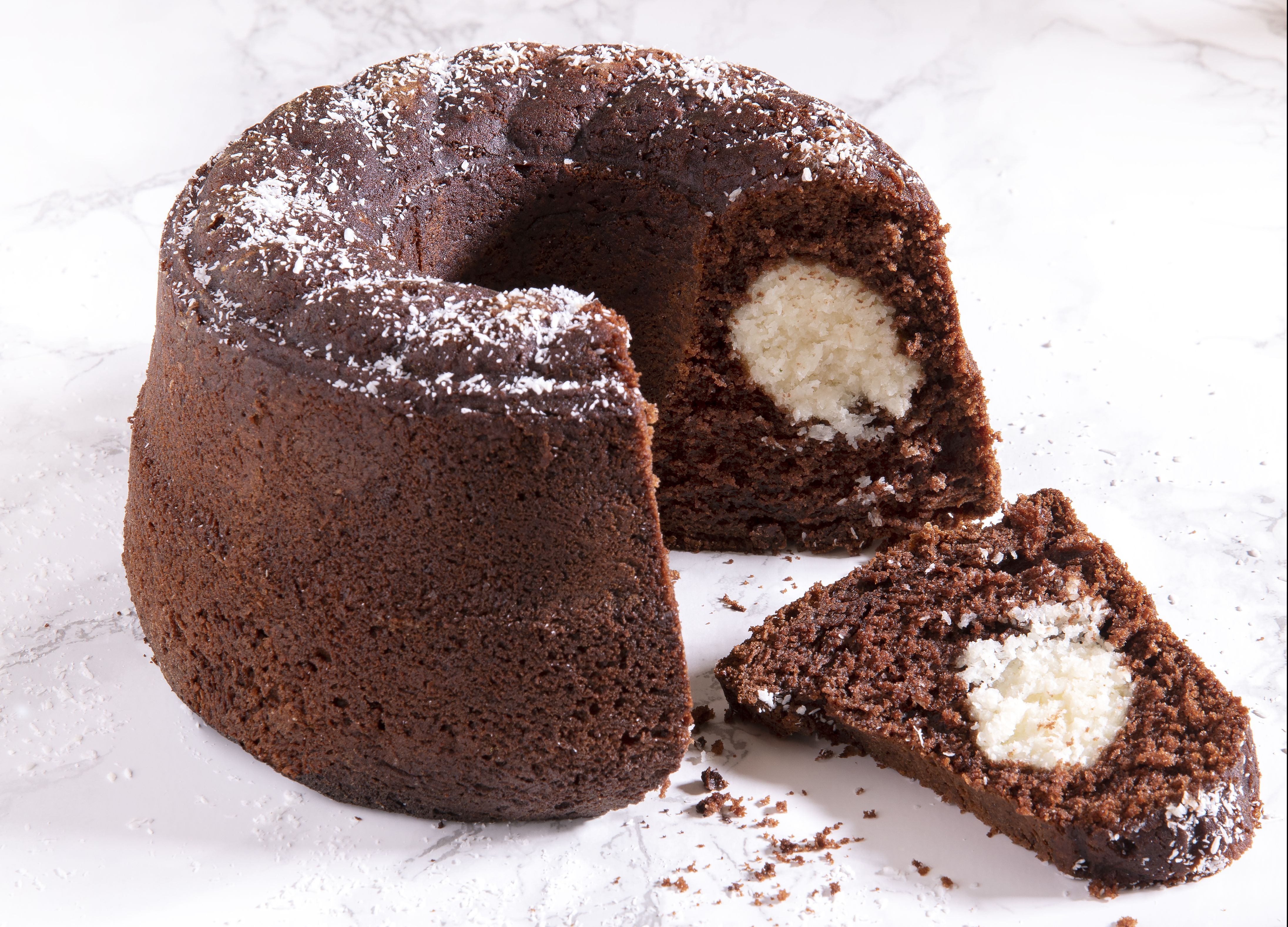 Βουτυρώνουμε και αλευρώνουμε μια στρογγυλή φόρμα για κέικ με τρύπα στη μέση. Αδειάζουμε στη φόρμα τη μισή ποσότητα από το μείγμα. Τοποθετούμε πάνω του τις μπάλες καρύδας και καλύπτουμε με το υπόλοιπο μείγμα. Βάζουμε το κέικ στον φούρνο για 50 λεπτά. Κάνουμε το τεστ με το μαχαίρι για να δούμε αν έχει ψηθεί μέχρι μέσα και το βγάζουμε από τον φούρνο. Ξεφορμάρουμε και αφήνουμε το κέικ να κρυώσει για 1 ώρα. Αν θέλουμε, το πασπαλίζουμε με ζάχαρη άχνη.