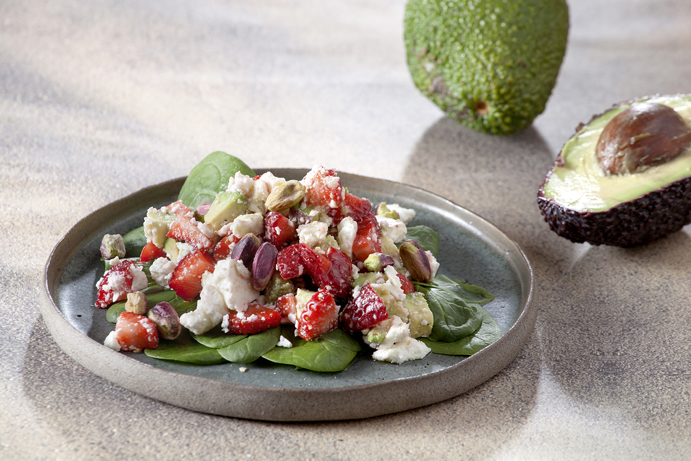 Σε ένα μπολ ανακατεύουμε το αβοκάντο με τη φέτα, το κρεμμυδάκι, τις φράουλες και μια κουταλιά της σούπας από το ντρέσινγκ.