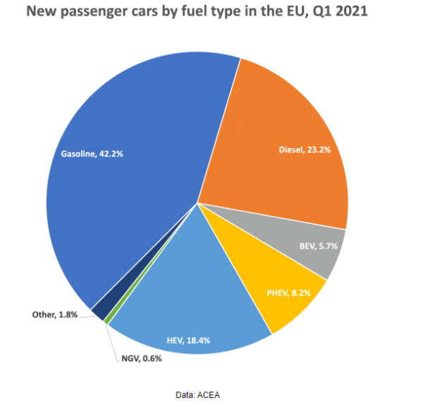 Ως αποτέλεσμα, το μερίδιο των βενζινοκίνητων στην αγορά αυτοκινήτων της ΕΕ μειώθηκε από 52,3% το πρώτο τρίμηνο του 2020 σε 42,2% κατά την ίδια περίοδο το 2021.