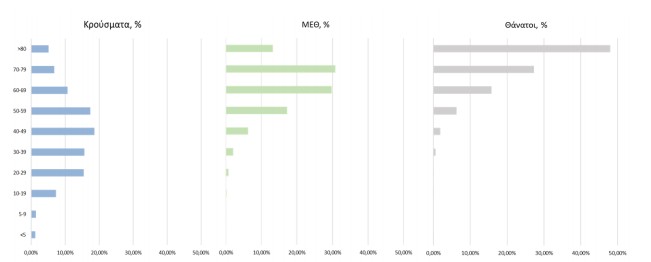 Ηλικιακή κατανομή κρουσμάτων, νοσηλευόμενων στις MEΘ και ασθενών που απεβίωσαν από την αρχή της πανδημίας.