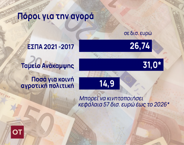 Στο συνολικό προϋπολογισμό του νέου ΕΣΠΑ των 26,7 δις ευρώ θα πρέπει να προσθέσουμε τα νέα προγράμματα αγροτικής ανάπτυξης. Το νέο ΠΑΑ 2021-2027 ανέρχεται σε 4,2 δις ευρώ, ενώ οι άμεσες ενισχύσεις της Κοινής Αγροτικής Πολιτικής (ΚΑΠ) για τη χώρα μας ανέρχονται στα 14,9 δις. Στις πιστώσεις αυτές θα πρέπει ακόμη να προστεθούν οι δράσεις για την ενίσχυση και τον εκσυγχρονισμό της αγροτικής παραγωγής μέσω του σχεδίου Ελλάδα 2.0 που υπερβαίνουν τα 800 εκατ. ευρώ και αφορούν αρδευτικές υποδομές, ψηφιακό εκσυγχρονισμό, ενίσχυση υδατοκαλλιεργειών και επενδυτικών σχεδίων στη μεταποίηση.