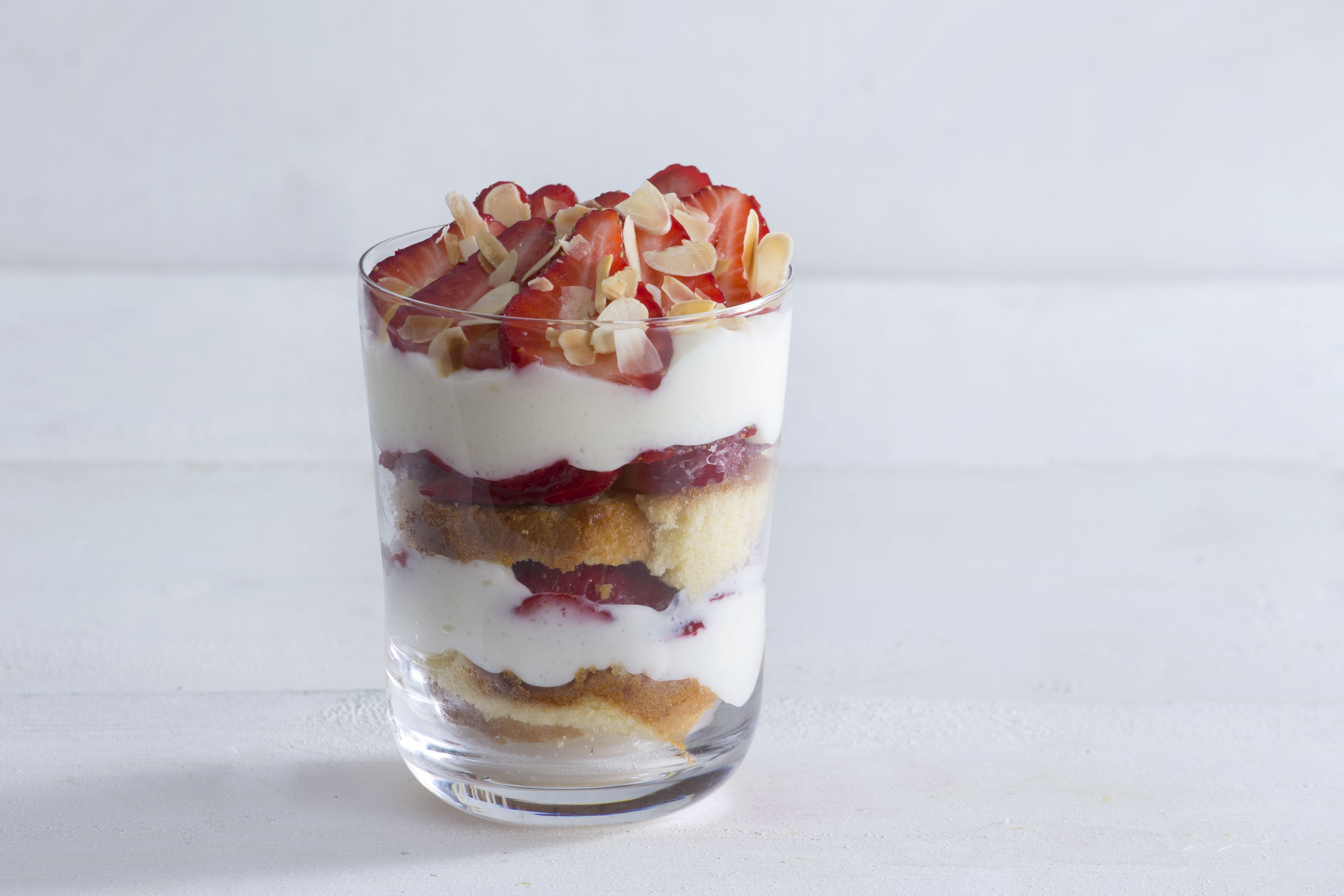 Ρίχνουμε από πάνω μία στρώση κρέμα και μία στρώση φράουλες (να καλύψουν όλη την επιφάνεια). Μοιράζουμε στα ποτήρια την υπόλοιπη κρέμα και καλύπτουμε με τις υπόλοιπες φράουλες. Πασπαλίζουμε με φιλέ αμυγδάλου.