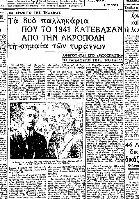 Τα δημοσιεύματα στον «Ριζοσπάστη» (αριστερά) και στην «Ελευθερία» (δεξιά) της 25ης Μαρτίου 1945, όπου Γλέζος και Σάντας αποκάλυψαν για πρώτη φορά ότι αυτοί ήταν που ταπείνωσαν τον Χίτλερ κατεβάζοντας τη σβάστικα από την Ακρόπολη τον Μάιο του ’41