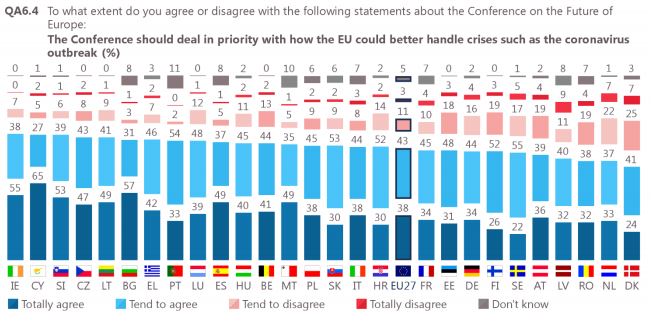 Περίπου οκτώ στους δέκα Ευρωπαίους (81%) συμφωνούν ότι μεταξύ των προτεραιοτήτων της Διάσκεψης θα πρέπει να είναι ο τρόπος με τον οποίο η ΕΕ θα μπορούσε να αντιμετωπίσει καλύτερα κρίσεις όπως η πανδημία COVID-19. Πάνω από το ένα τρίτο των συμμετεχόντων (38%) συμφωνεί απόλυτα με τη δήλωση αυτή.