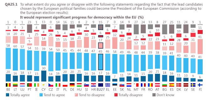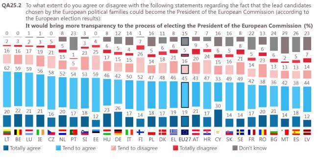 Αν και το 61% συμφωνεί ότι μια τέτοια διαδικασία θα είχε νόημα μόνο εάν δοθεί στους πολίτες της ΕΕ η δυνατότητα να ψηφίσουν με υπερεθνικά ψηφοδέλτια, σχεδόν τα δύο τρίτα των ερωτηθέντων (64%) συμφωνούν ότι η προσέγγιση αυτή θα προσδώσει μεγαλύτερη διαφάνεια στη διαδικασία εκλογής του Προέδρου της Ευρωπαϊκής Επιτροπής.