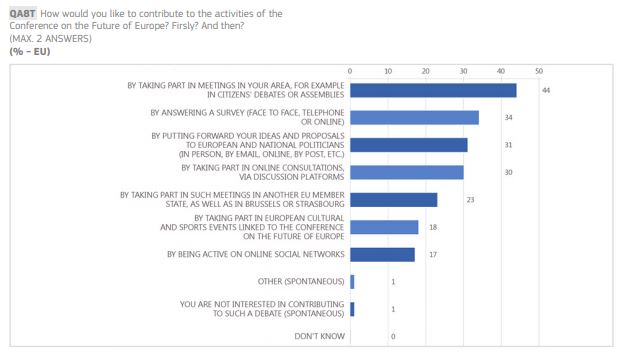Οι Ευρωπαίοι που επιθυμούν να συμμετάσχουν στη Διάσκεψη για το Μέλλον της Ευρώπης θα ήθελαν πρωτίστως να το πράξουν μέσω συναντήσεων στην περιοχή τους, όπως συζητήσεις ή συνελεύσεις πολιτών (44%).