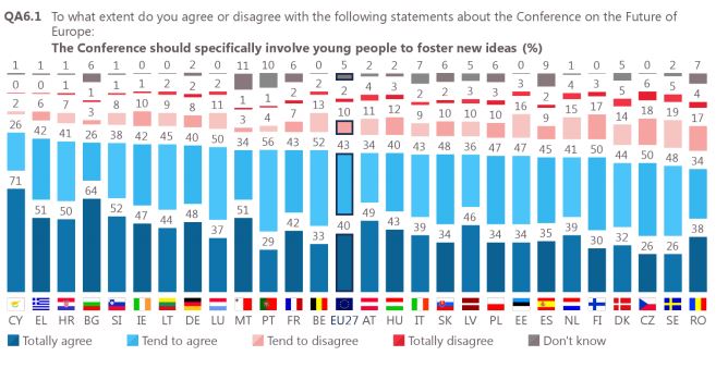 Περισσότεροι από οκτώ στους δέκα Ευρωπαίους (83%) συμφωνούν ότι η Διάσκεψη θα πρέπει να συμπεριλάβει ειδικά τους νέους για την προώθηση νέων ιδεών, συμπεριλαμβανομένου ενός ποσοστού 40% που συμφωνεί απόλυτα με αυτή την ιδέα.