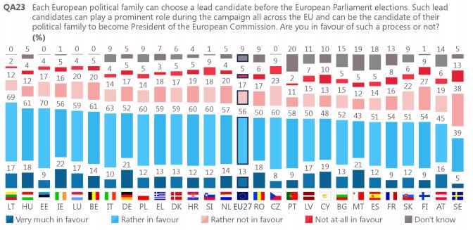 Πάνω από τα δύο τρίτα των ερωτηθέντων τάσσονται υπέρ της διαδικασίας εκλογής του προέδρου της Ευρωπαϊκής Επιτροπής μέσω της διαδικασίας των κορυφαίων υποψηφίων στις ευρωπαϊκές εκλογές, ενώ λιγότερο από το ένα τέταρτο (22%) δήλωσε κατά της ιδέας.
