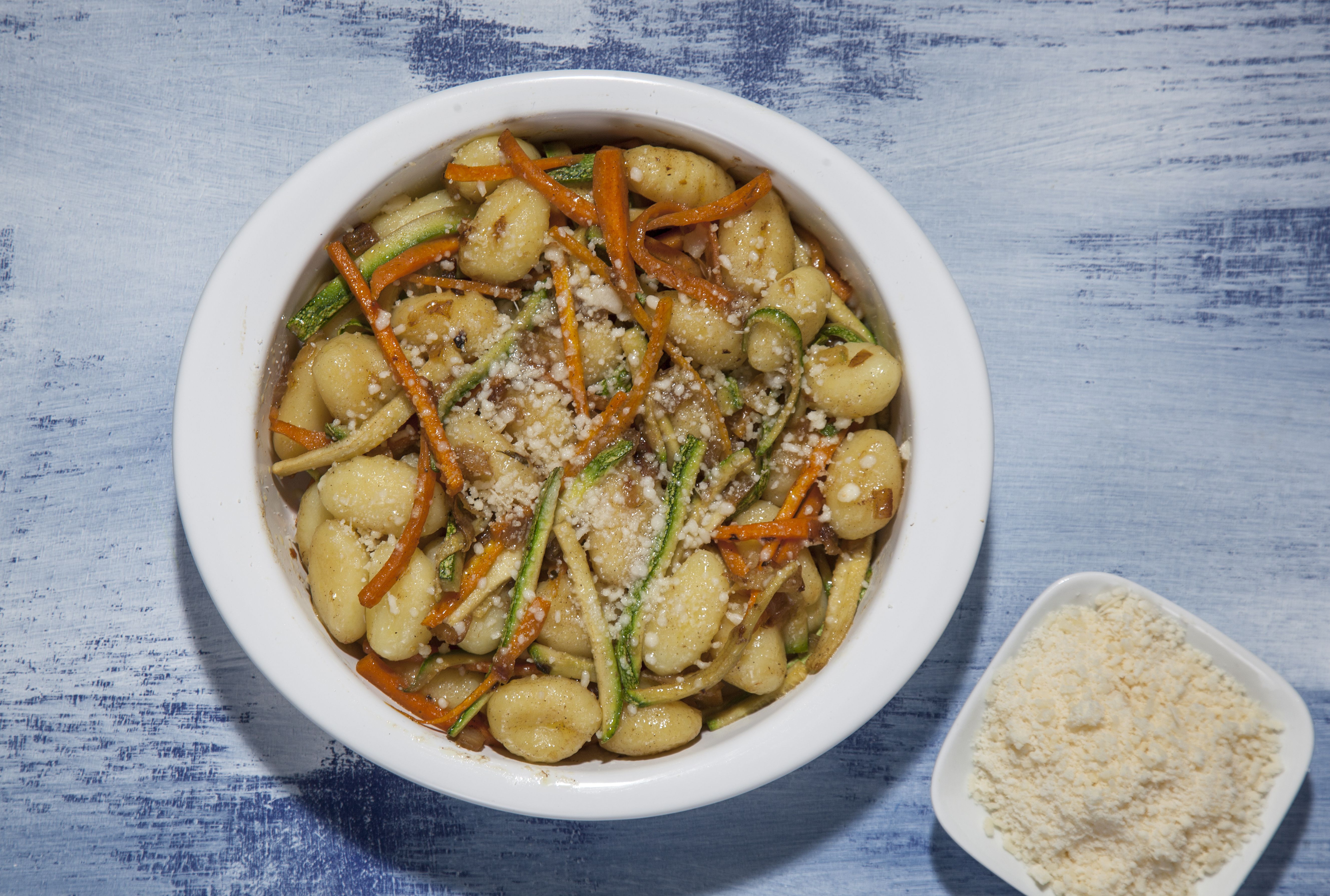 Προθερμαίνουμε τον φούρνο στους 200°C. Ζεσταίνουμε σε μια αντικολλητική κατσαρόλα το ελαιόλαδο και σοτάρουμε το κρεμμύδι με το σκόρδο μέχρι να μαραθούν. Προσθέτουμε τα λαχανικά και τον ζωμό και μαγειρεύουμε για 5 λεπτά. Παράλληλα, βράζουμε τα νιόκι σύμφωνα με τις οδηγίες που αναγράφονται στη συσκευασία τους. Τα βγάζουμε από το νερό με μια τρυπητή κουτάλα και τα ρίχνουμε στην κατσαρόλα με τα λαχανικά. Συνεχίζουμε το μαγείρεμα για 5 λεπτά και μοιράζουμε τα νιόκι σε 4 μικρά, αντικολλητικά πυρίμαχα μπολ. Πασπαλίζουμε με την παρμεζάνα.