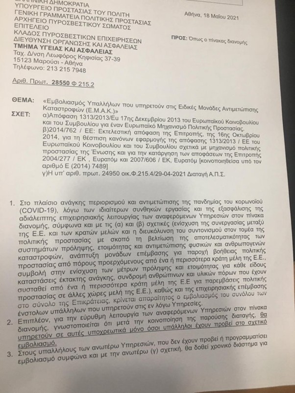 Με το ίδιο έγγραφο καλούνται τα στελέχη των ΕΜΑΚ που δεν έχουν εμβολιαστεί, αλλά το επιθυμούν, να το πράξουν ως τις 11 Ιουνίου με την ειδοποίηση ότι σε αντίθετη περίπτωση θα αντικατασταθούν από άλλα στελέχη της Πυροσβεστικής Υπηρεσίας, που θα έχουν ολοκληρώσει των εμβολιασμό τους.