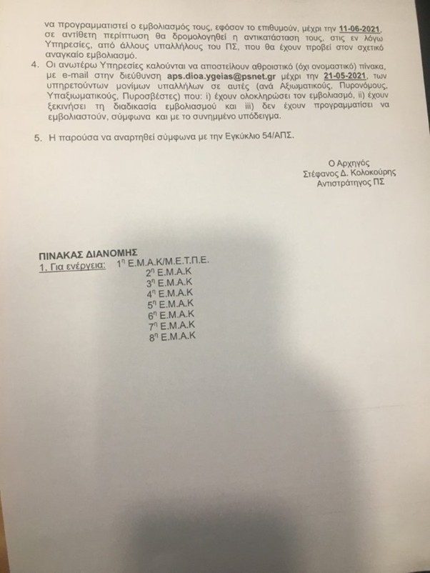 Καλούνται δε οι διοικήσεις των ΕΜΑΚ, να ενημερώσουν ως τις 21 Μαΐου το Αρχηγείο, ποια στελέχη τους έχουν προβεί στον εμβολιασμό τους, ποια στελέχη έχουν κινήσει τη διαδικασία να εμβολιαστούν και ποια στελέχη δεν έχουν προγραμματίσει τον εμβολιασμό τους.