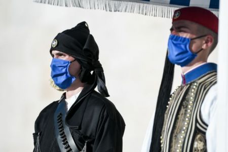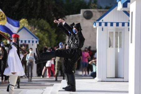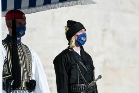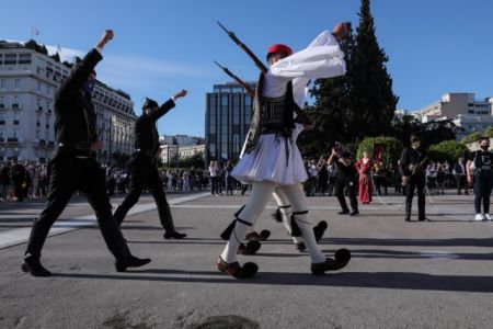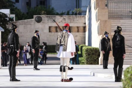 Στο Μνημείο του Αγνώστου Στρατιώτη, η αλλαγή της Προεδρικής φρουράς πραγματοποιήθηκε με τη συμμετοχή Ευζώνων οι οποίοι φορούν τις παραδοσιακές ποντιακές στολές.
