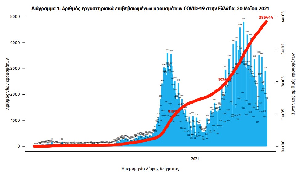 Ο συνολικός αριθμός των κρουσμάτων ανέρχεται σε 385.444 (ημερήσια μεταβολή +0.5%), εκ των οποίων 51.2% άνδρες. Με βάση τα επιβεβαιωμένα κρούσματα των τελευταίων 7 ημερών, 28 θεωρούνται σχετιζόμενα με ταξίδι από το εξωτερικό και 2.157 είναι σχετιζόμενα με ήδη γνωστό κρούσμα.