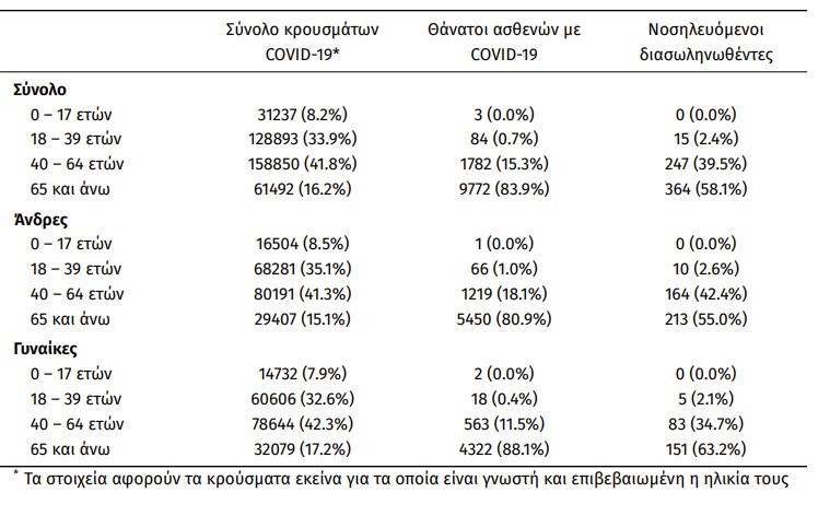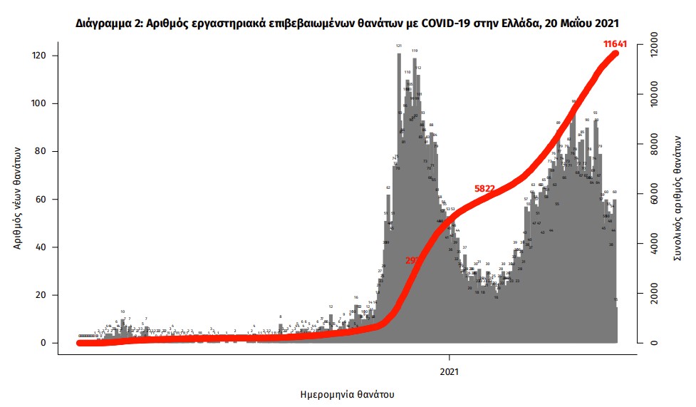Οι νέοι θάνατοι ασθενών με COVID-19 είναι 54, ενώ από την έναρξη της επιδημίας έχουν καταγραφεί συνολικά 11.641 θάνατοι. Το 95.2% είχε υποκείμενο νόσημα ή/και ηλικία 70 ετών και άνω.
