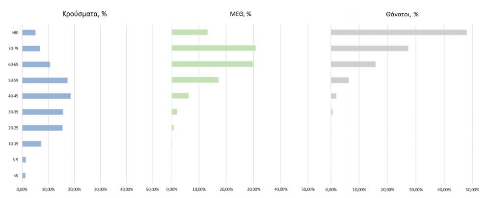 Ο αριθμός των ασθενών που νοσηλεύονται διασωληνωμένοι είναι 626 (61.8% άνδρες). Η διάμεση ηλικία τους είναι 67 έτη. To 82.7% έχει υποκείμενο νόσημα ή/και ηλικία 70 ετών και άνω. Από την αρχή της πανδημίας έχουν εξέλθει από τις ΜΕΘ 2.314 ασθενείς. Οι εισαγωγές νέων ασθενών Covid-19 στα νοσοκομεία της επικράτειας είναι 295 (ημερήσια μεταβολή -3.28%). Ο μέσος όρος εισαγωγών του επταημέρου είναι 317 ασθενείς.