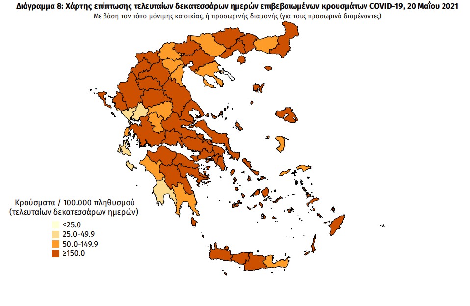Ο χάρτης αποτυπώνει τη γεωγραφική κατανομή των συνολικών κρουσμάτων COVID-19 (από την αρχή της επιδημίας) ανά Περιφερειακή Ενότητα της χώρας, με βάση την δηλωθείσα διεύθυνση μόνιμης κατοικίας του ασθενούς, ή τη διεύθυνση προσωρινής διαμονής για τους τουρίστες και άλλους προσωρινά διαμένοντες στην Ελλάδα. Συμπεριλαμβάνονται τόσο κρούσματα με ιστορικό ταξιδίου (“εισαγόμενα”) όσο και κρούσματα με πιθανή εγχώρια μετάδοση.