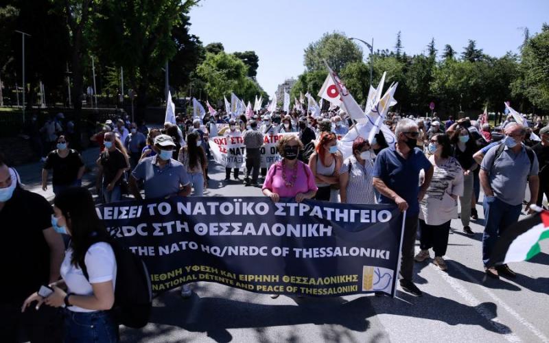 Οι διαδηλωτές πραγματοποίησαν συγκέντρωση απέναντι από το Γ’ Σώμα Στρατού, απαιτώντας να κλείσει το ΝΑΤΟικό στρατηγείο ενώ εξέφρασαν την αλληλεγγύη τους στον Παλαιστινιακό λαό.