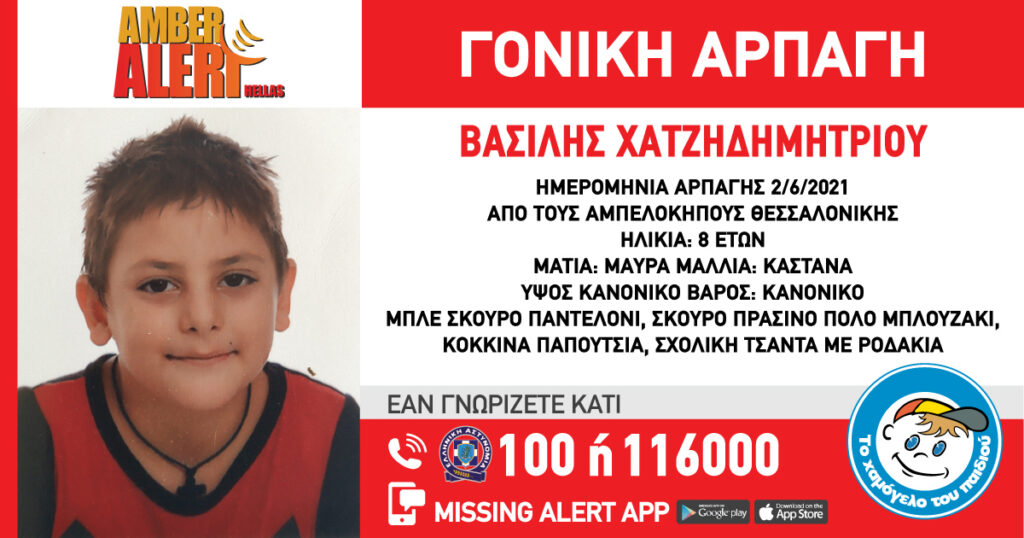 Πρόκειται για τον 8χρονο Βασίλη Χατζηδημητρίου. Ο Βασίλης Χατζηδημητρίου έχει καστανά μαλλιά, μαύρα μάτια, κανονικό ύψος και κανονικό βάρος. Την ημέρα που εξαφανίστηκε φορούσε σκούρο μπλε παντελόνι, σκούρα κοντομάνικη πράσινη μπλούζα τύπου πόλο, κόκκινα παπούτσια και κρατούσε σχολική τσάντα με ροδάκια.