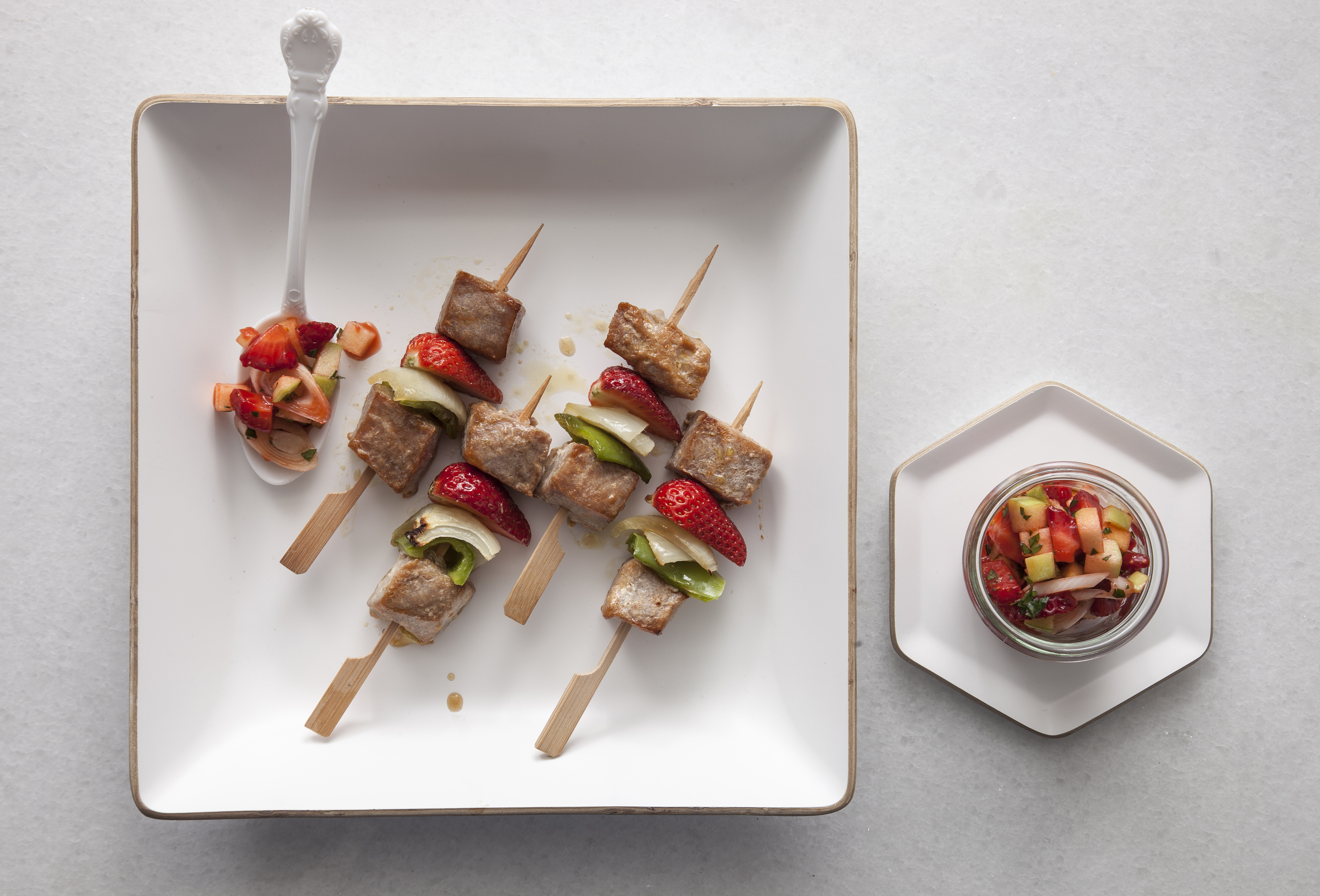 Σε κάθε καλαμάκι περνάμε 2 κομμάτια τόνου και ανάμεσά τους 1 κομμάτι κρεμμύδι, 1 κομμάτι πιπεριά και μισή φράουλα. Ρίχνουμε σε ένα αντικολλητικό τηγάνι ή σχαροτήγανο 1 κ.γ. ελαιόλαδο και το βάζουμε σε δυνατή φωτιά να κάψει. Ψήνουμε τα σουβλάκια για περίπου 10 λεπτά (αν μας αρέσει τρυφερό), γυρίζοντάς τα, ώσπου να ψηθούν από όλες τις πλευρές. Περιχύνουμε με την σάλτσα.