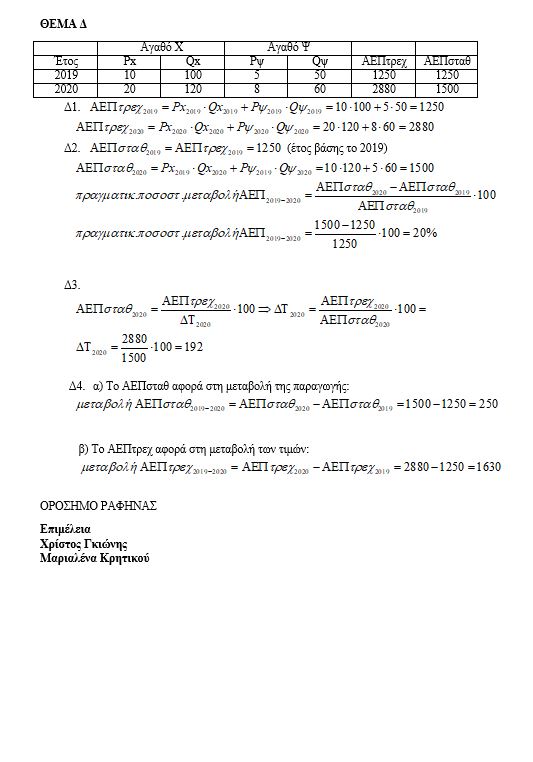 Δ2. Να υπολογιστεί η πραγματική ποσοστιαία μεταβολή του ΑΕΠ μεταξύ των 2 ετών, λαμβάνοντας ως έτος βάσης το 2019. Σε τι συμπέρασμα καταλήγουμε για το επίπεδο ευημερίας της χώρας εάν γνωρίζουμε ότι ο πληθυσμός δεν μεταβλήθηκε;