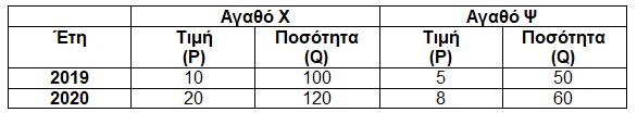 Κατά τα έτη 2019 και 2020, πραγματοποιήθηκαν για τη χώρα Α οι ακόλουθες μετρήσεις που αφορούν 2 αγαθά Χ και Ψ: