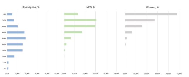 Ηλικιακή Κατανομή κρουσμάτων, νοσηλευόμενων στις MEΘ και ασθενών που απεβίωσαν από την αρχή της πανδημίας
