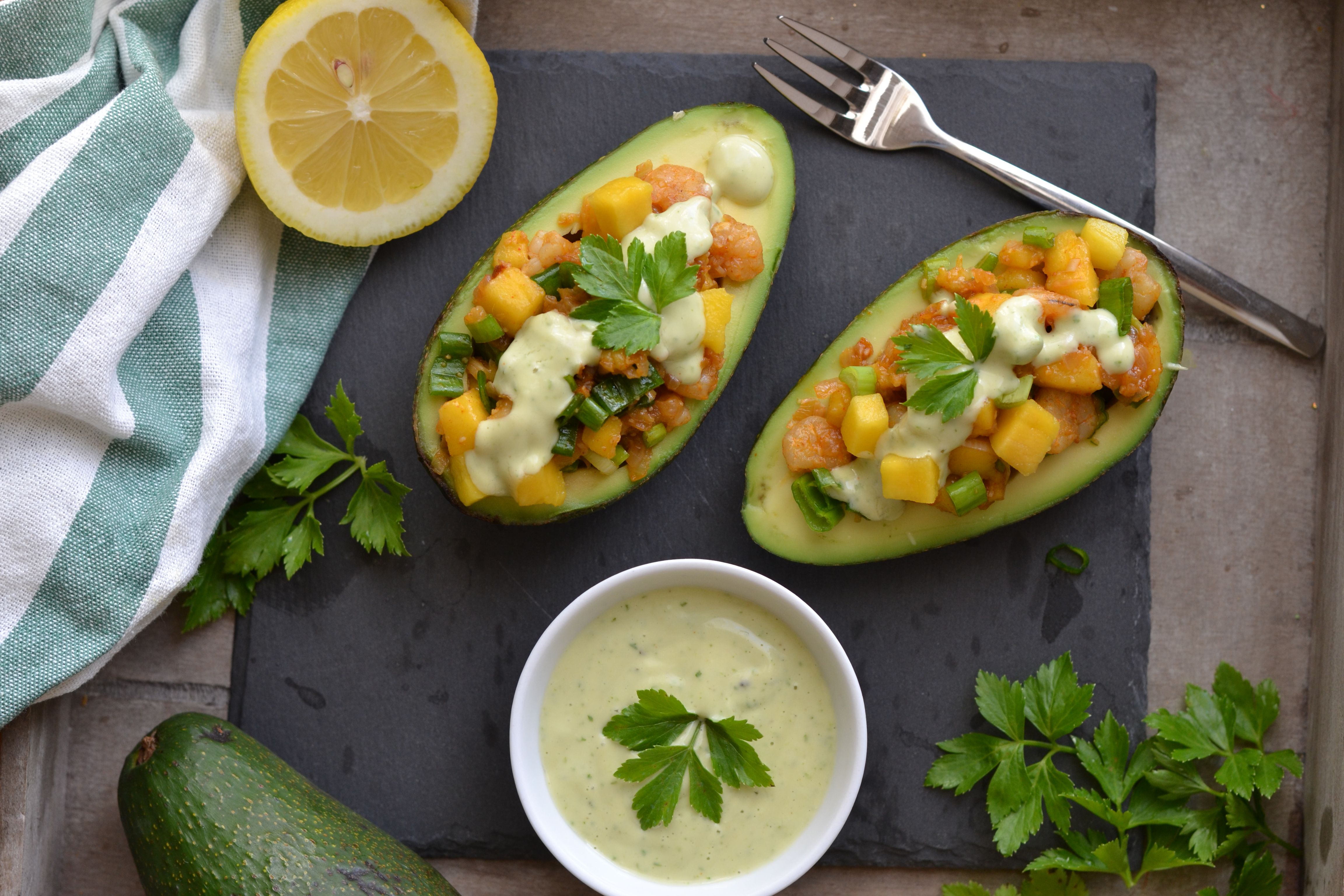 Κόβουμε το αβοκάντο στη μέση, αφαιρούμε το κουκούτσι του και βγάζουμε 1 κ.σ. από το εσωτερικό τού κάθε κομματιού για να το χρησιμοποιήσουμε στη σάλτσα. Σε αντικολλητικό τηγάνι ζεσταίνουμε το ελαιόλαδο και σοτάρουμε το ξερό κρεμμύδι μέχρι να πάρει χρώμα. Ρίχνουμε την πάπρικα, το τσίλι και το αλάτι και ανακατεύουμε. Προσθέτουμε τις γαρίδες και συνεχίζουμε το σοτάρισμα για 2 λεπτά. Σβήνουμε τη φωτιά και προσθέτουμε το μάνγκο και τα πράσινα κρεμμυδάκια. Ανακατεύουμε 2-3 φορές. Μοιράζουμε το μείγμα στα αβοκάντο.