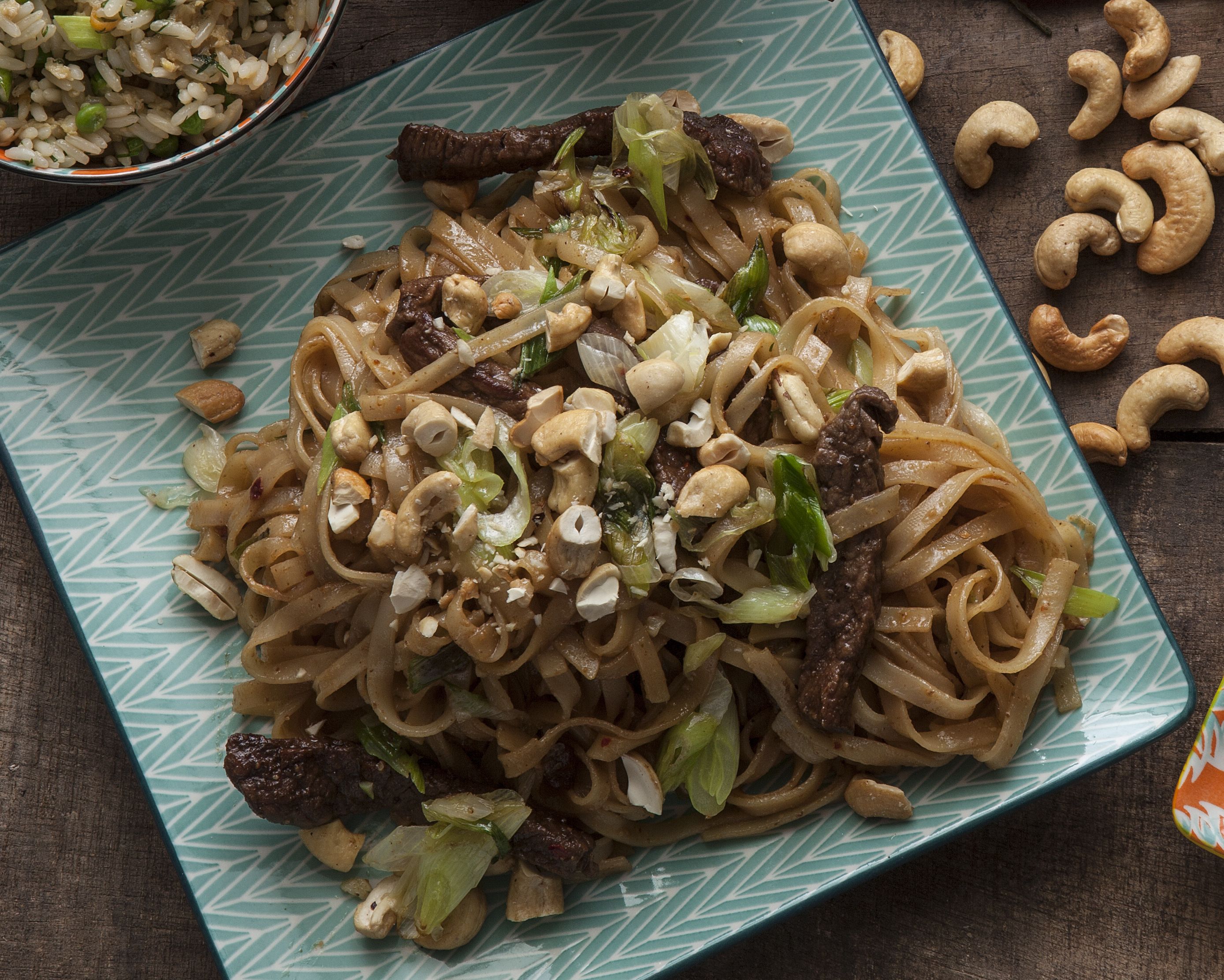 Εν τω μεταξύ, σε ένα μπολ βάζουμε το φιστικοβούτυρο, τη σόγια σος, το υπόλοιπο ελαιόλαδο, τον χυμό λεμονιού και το μπούκοβο. Ανακατεύουμε καλά και αραιώνουμε με το νερό που κρατήσαμε στην άκρη. Ρίχνουμε τη σος στην κατσαρόλα με τα νουντλς. Προσθέτουμε τα σκαλοπίνια, τα κρεμμυδάκια και τα κάσιους, ανακατεύουμε και σερβίρουμε.