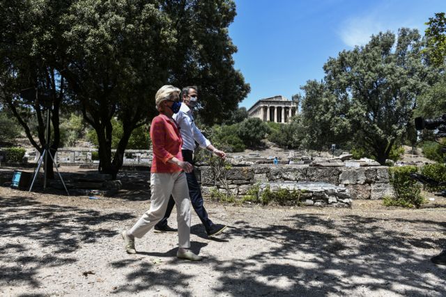 Η εικόνα του Πρωθυπουργού (με καλοκαιρινή αμφίεση, ήτοι λευκό πουκάμισο, sneakers παπούτσια) και της Ούρσουλα φον ντερ Λάιεν (με λευκό παντελόνι, με λευκή μπλούζα, λευκά sneakers παπούτσια, λευκά καλτσάκια) και με χρώμα σακακιού (της τελευταίας λέξης της μόδας) , ήτοι πορτοκαλί με μωβ λεπτομέρειες , καθισμένοι κάτω από μια αιώνια ελιά σε λευκές καρέκλες στο μέσο της Αρχαίας Αγοράς, με φόντο την στοά του Αττάλου και δίπλα από τον Ναό του Ηφαίστου ήταν εντυπωσιακή και έγινε για τις ανάγκες της εφαρμογής του Ταμείου Ανάπτυξης. Ο Πρωθυπουργός είπε ότι επέλεξε την Αρχαία Αγορά, που είναι τόπος δημοκρατικού διαλόγου ως την «καρδιά» του παρελθόντος μας, αλλά και στην παντοτινή έδρα της Δημοκρατίας που σήμερα υποδέχεται ένα σύγχρονο επίτευγμά της.