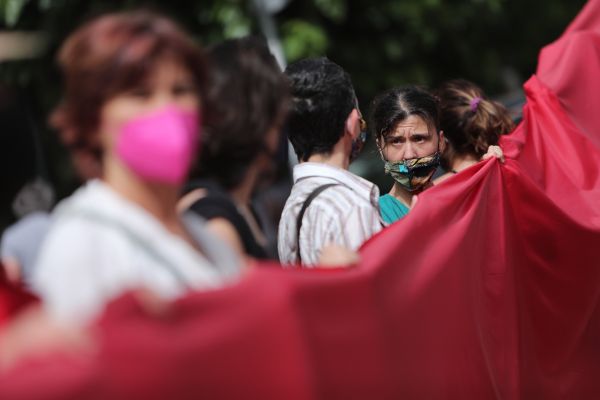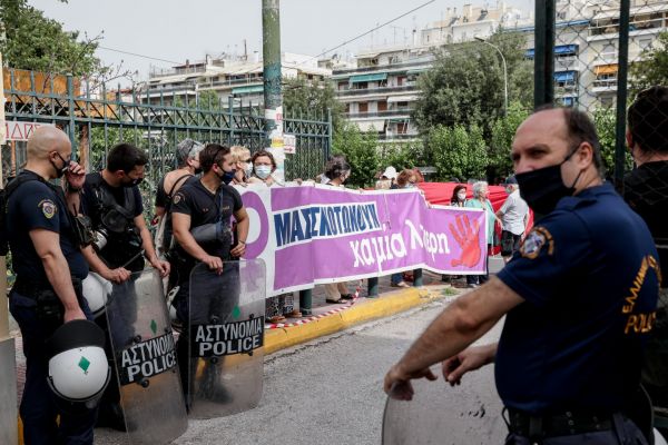 Συγκέντρωση έξω από τα δικαστήρια Ευελπίδων, όπου οδηγήθηκε ο συζυγοκτόνος, Μπάμπης Αναγνωστόπουλος, συγκεντρώθηκε πλήθος κόσμου για να φωνάξει κατά των γυναικοκτονιών.