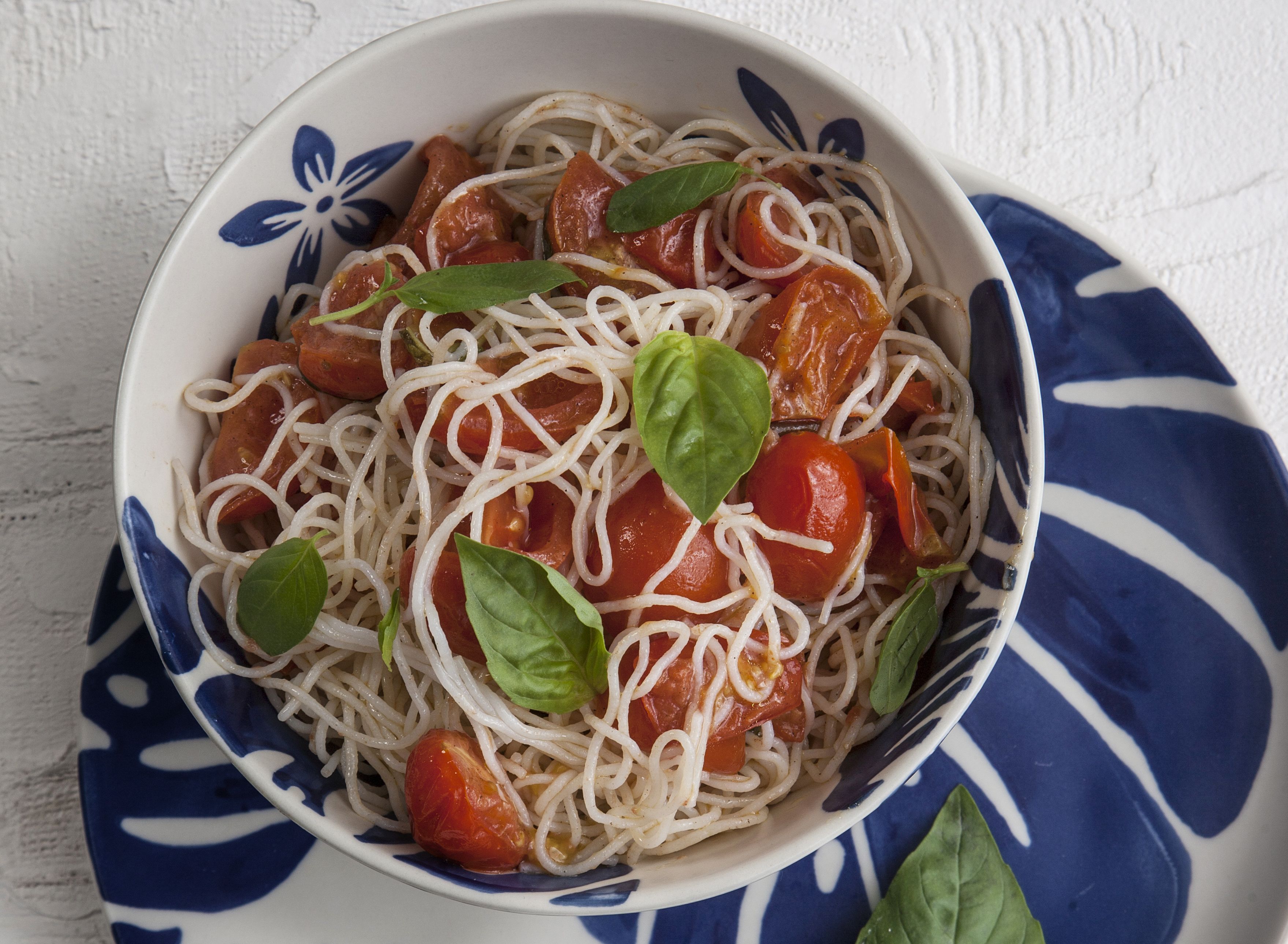 Ρίχνουμε το λάδι σε μια κατσαρόλα και σοτάρουμε για περίπου 1 λεπτό την πιπεριά και τον βασιλικό. Προσθέτουμε τα ντοματίνια και ¼ φλ. νερό και μαγειρεύουμε, ανακατεύοντας τακτικά, για 8-10 λεπτά, μέχρι να «σπάσουν» τα ντοματίνια. Αλατίζουμε. Αποσύρουμε από τη φωτιά και ρίχνουμε μέσα τα νουντλς. Ανακατεύουμε καλά. Σερβίρουμε με λίγο ωμό ελαιόλαδο από πάνω και φρέσκο βασιλικό.