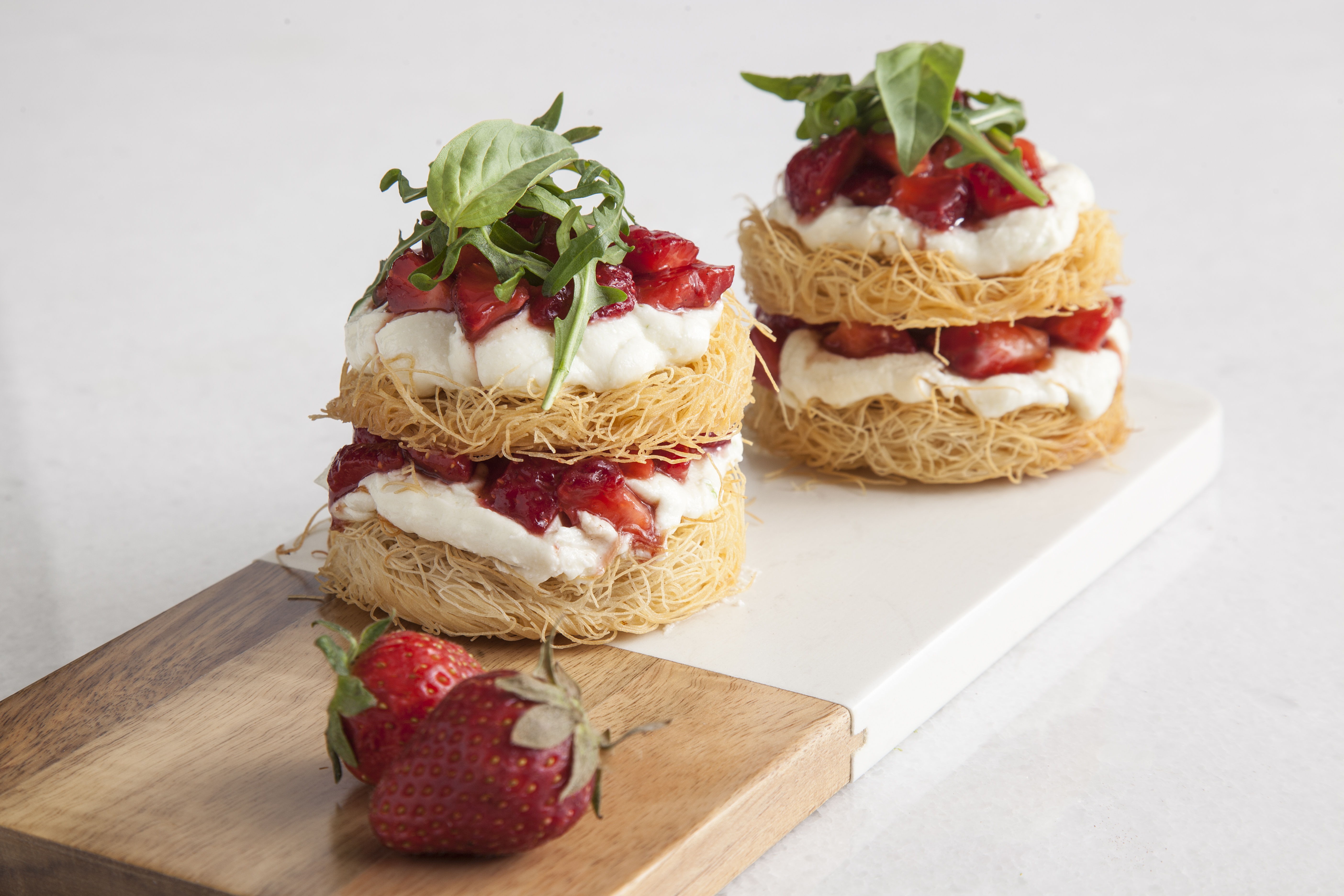 Σουρώνουμε τις φράουλες. Βάζουμε σε ένα πιάτο έναν δίσκο κανταΐφι και, με το κορνέ, μια στρώση μους τυριών. Από πάνω ρίχνουμε μερικές φράουλες και σκεπάζουμε με έναν δίσκο. Βάζουμε ακόμη μία στρώση μους και γαρνίρουμε με μερικές φράουλες, μερικά φρέσκα φύλλα βασιλικού και τα φύλλα της baby ρόκας.