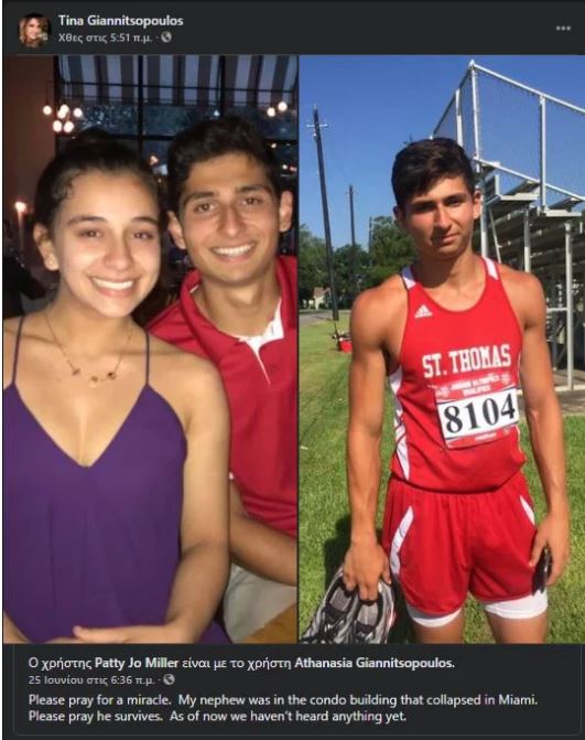 Κορυφώνεται η αγωνία της οικογένειας και των συγγενών του 21χρονου Έλληνα ομογενή, Αντρέα Γιαννιτσόπουλου με καταγωγή από την Ξάνθη, του οποίου το όνομα βρίσκεται στη λίστα των 159 αγνοουμένων μετά τη ξαφνική κατάρρευση της 12όροφης πολυκατοικίας στο Μαϊάμι.