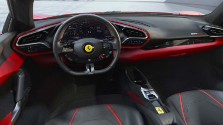 Σε ό,τι αφορά το εσωτερικό της νέας Ferrari, οι επιρροές από την επίσης υβριδική SF90 Stradale είναι περισσότερο από εμφανείς ωστόσο στην προκειμένη περίπτωση, οι σχεδιαστές της φίρμας επέλεξαν μια πιο σοφιστικέ και μινιμαλιστική προσέγγιση. Έτσι, αν στην κεντρική κονσόλα ξεχωρίζει ο γνωστός επιλογές σε διάταξη “H” που συναντάμε και στην SF90, το ταμπλό ακολουθεί μια πιο απλή σχεδίαση με λιγότερες πτυχώσεις και αεραγωγούς.