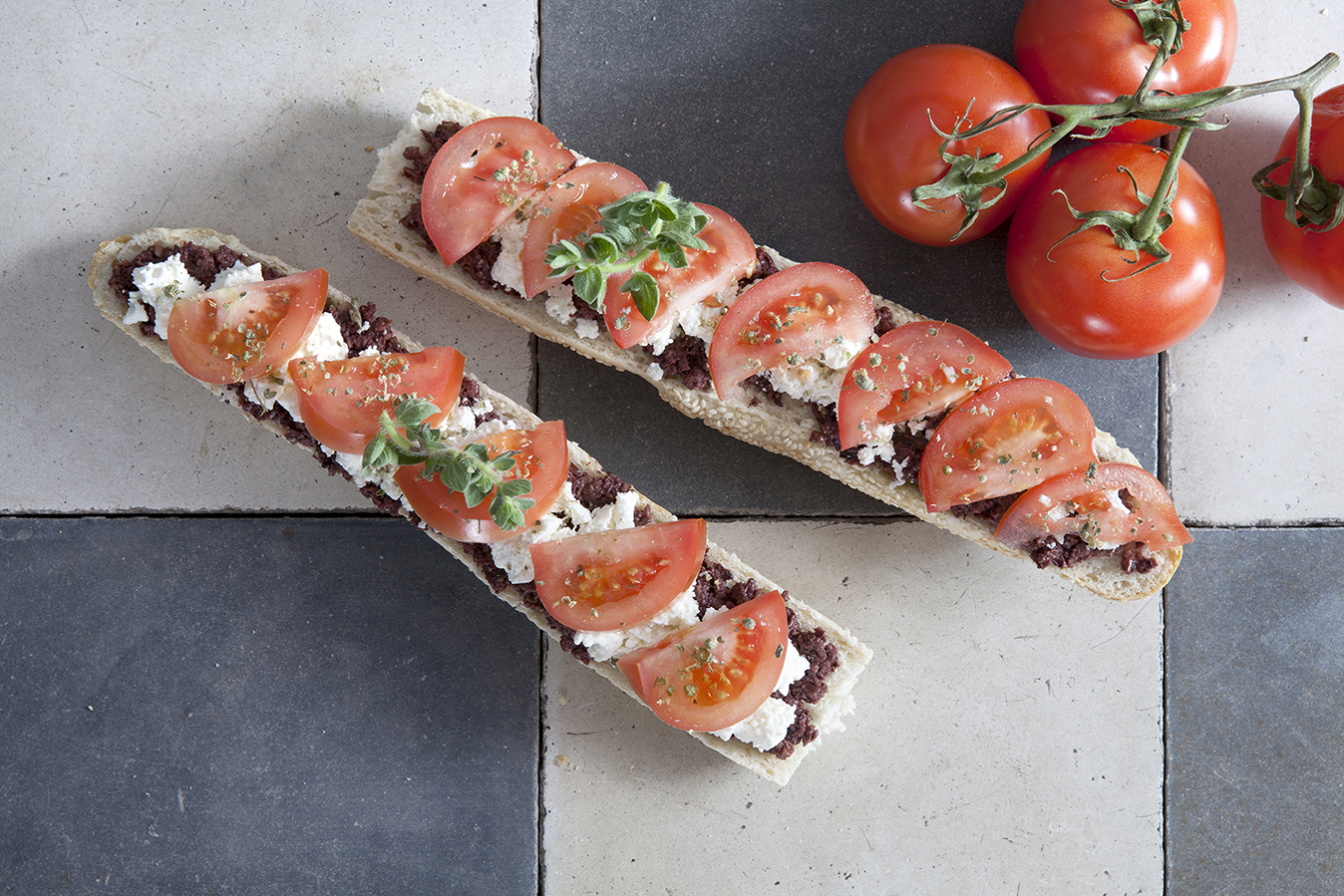 Κόβουμε την μπαγκέτα κατά μήκος στα δύο. Βάζουμε τις φέτες ανοιχτές πάνω στον πάγκο εργασίας. Αλείφουμε την πάστα ελιάς και από πάνω απλώνουμε την ξινομυζήθρα. Τοποθετούμε τις φέτες της ντομάτας στη σειρά, τρίβουμε από πάνω λίγη ρίγανη και λίγο αλατοπίπερο. Κλείνουμε με την άλλη μισή φέτα και κόβουμε το σάντουιτς στα δύο.