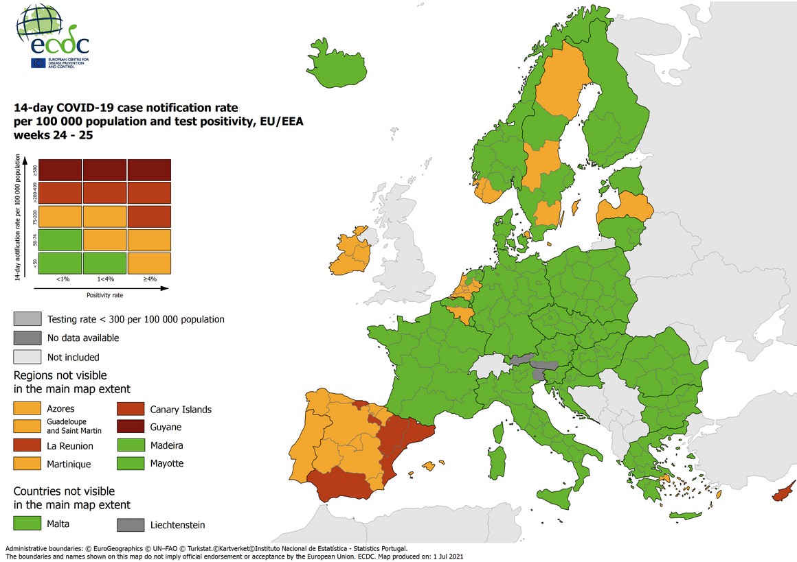 Το ECDC έδωσε στη δημοσιότητα τους χάρτες που δημοσιεύονται κάθε εβδομάδα και η Ελλάδα είναι στο «πράσινο», με εξαίρεση ορισμένες περιοχές.
