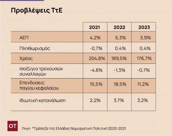 Το 2022 και το 2023 ο γενικός δείκτης θα καταγράψει θετικό αλλά χαμηλό ρυθμό μεταβολής. Ο πυρήνας του πληθωρισμού αναμένεται να κινηθεί σε χαμηλότερα επίπεδα από εκείνα του γενικού δείκτη το 2021, καθώς οι δύο βασικές συνιστώσες του (υπηρεσίες και μη ενεργειακά αγαθά) θα διατηρηθούν σε αρνητικό έδαφος λόγω των πολλών αβεβαιοτήτων, ενώ τα επόμενα δύο έτη θα ακολουθήσει την πορεία του γενικού δείκτη.