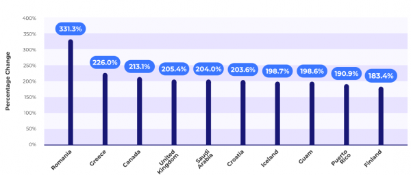 Ειδικότερα, η Ρουμανία σημείωσε τη μεγαλύτερη ετήσια αύξηση στις αναζητήσεις με ποσοστό 331% και ακολουθεί η Ελλάδα με 226% και ο Καναδάς με 213,1%.