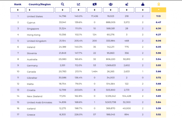 Οι Ηνωμένες Πολιτείες είναι η πιο «έτοιμη για κρυπτονομίσματα» χώρα στον κόσμο. Η Κύπρος κατέλαβε τη δεύτερη και τη Σιγκαπούρη τρίτη.