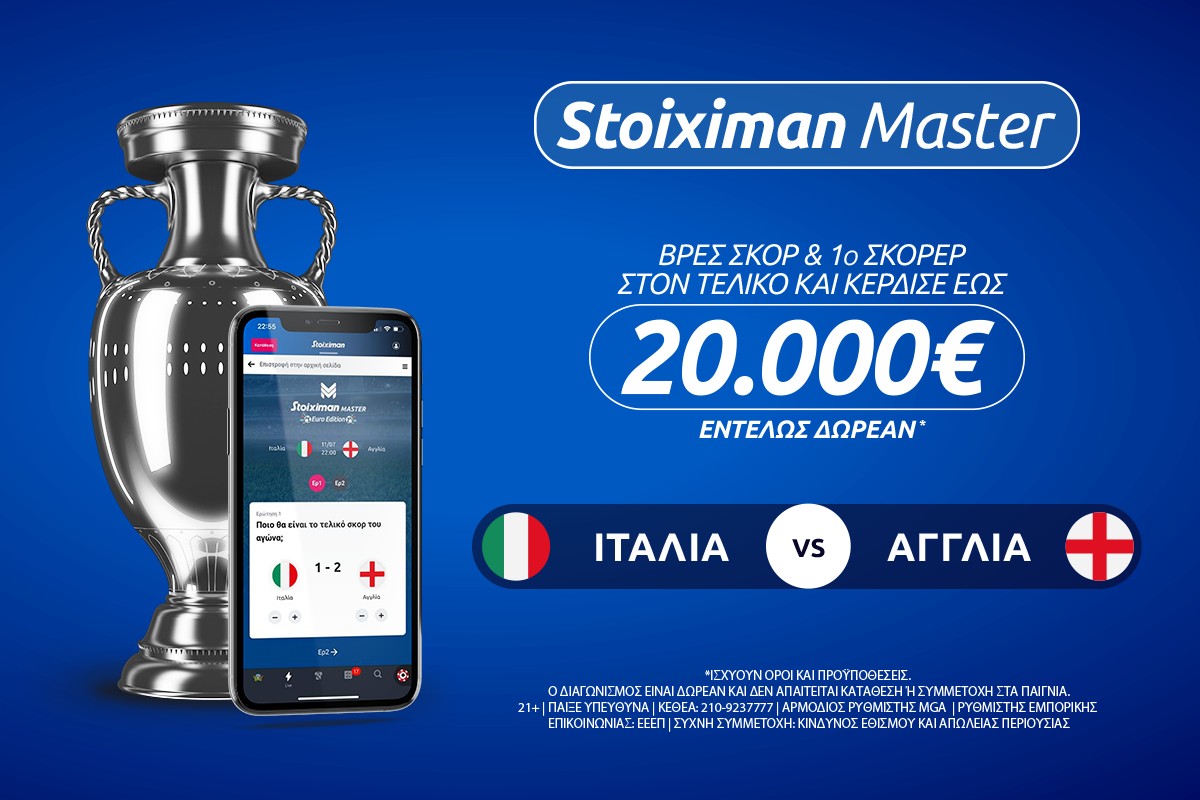 Η ώρα για να μάθουμε τη νέα πρωταθλήτρια Ευρώπης πλησιάζει! Το βράδυ της Κυριακής (11/07, 22:00) το Euro 2020 ολοκληρώνεται στο Γουέμπλεϊ με τη διεξαγωγή του τελικού ανάμεσα στην Ιταλία και την Αγγλία. Μαζί ολοκληρώνεται και η Euro έκδοση του Stoiximan Master, με μία μεγάλη διαφορά σε σχέση με τα προηγούμενα ματς. Στον τελικό της διοργάνωσης, η Stoiximan θα προσφέρει 20.000 εντελώς δωρεάν* στον ή στους νικητές!